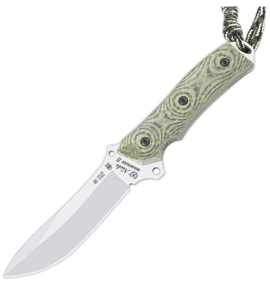Empuñadura con forros de acero inoxidable con cachas en G10 con separadores de fibra verdes. Terminación de la empuñadura con pomo percutor con hueco para cordón fiador incluido.