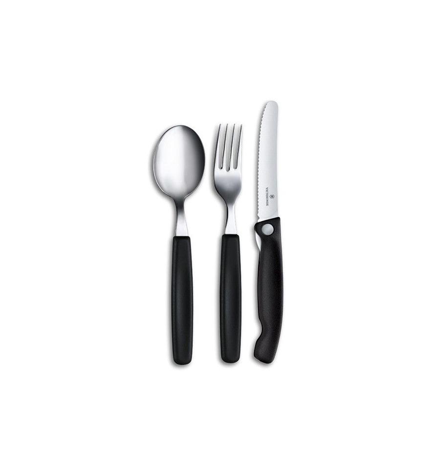 set de cubiertos de 3 piezas de Victorinox es la elección perfecta. Compacto y fácil de llevar gracias al cuchillo de mesa plegable. Fabricado en acero inoxidable y con un mango de plástico.