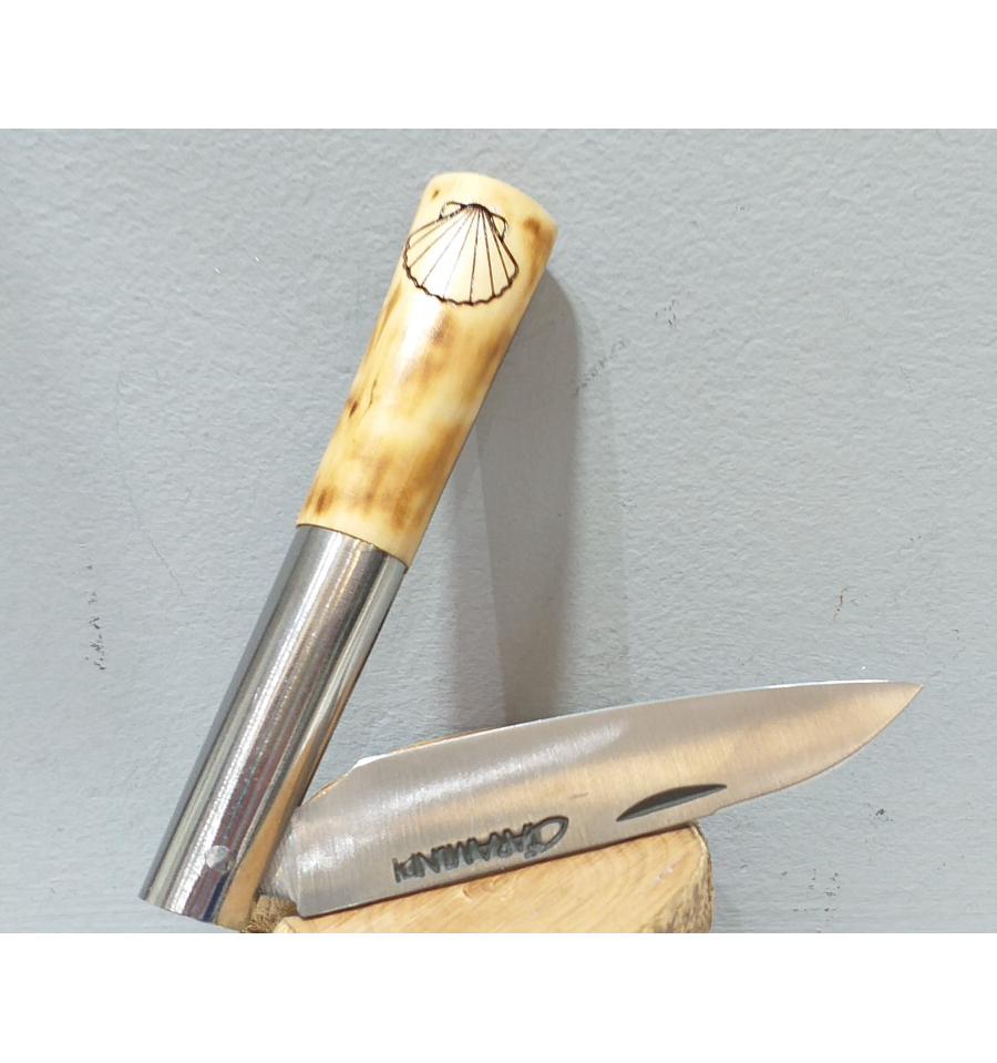 Navaja, hoja de 7 cm. concha de acero inox.mova. Mango de madera de boj pirograbado a mano.