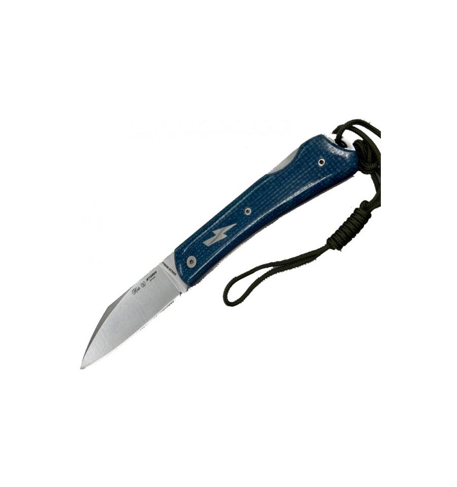 Empuñadura con forros de fibra rojos y cachas en Micarta Azul. Rayo incrustado .